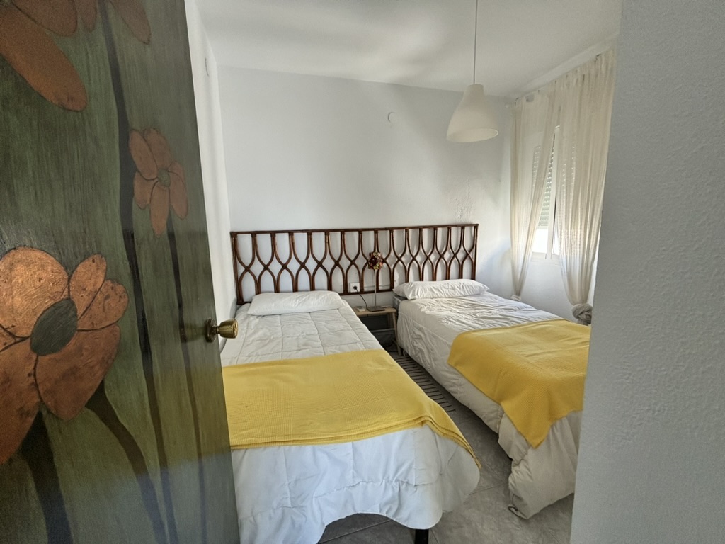 Hay dos dormitorios, uno con cama de matrimonio y una preciosa terraza con vistas al mar; un segundo dormitorio con dos camas individuales, la cocina y el baño con bañera.