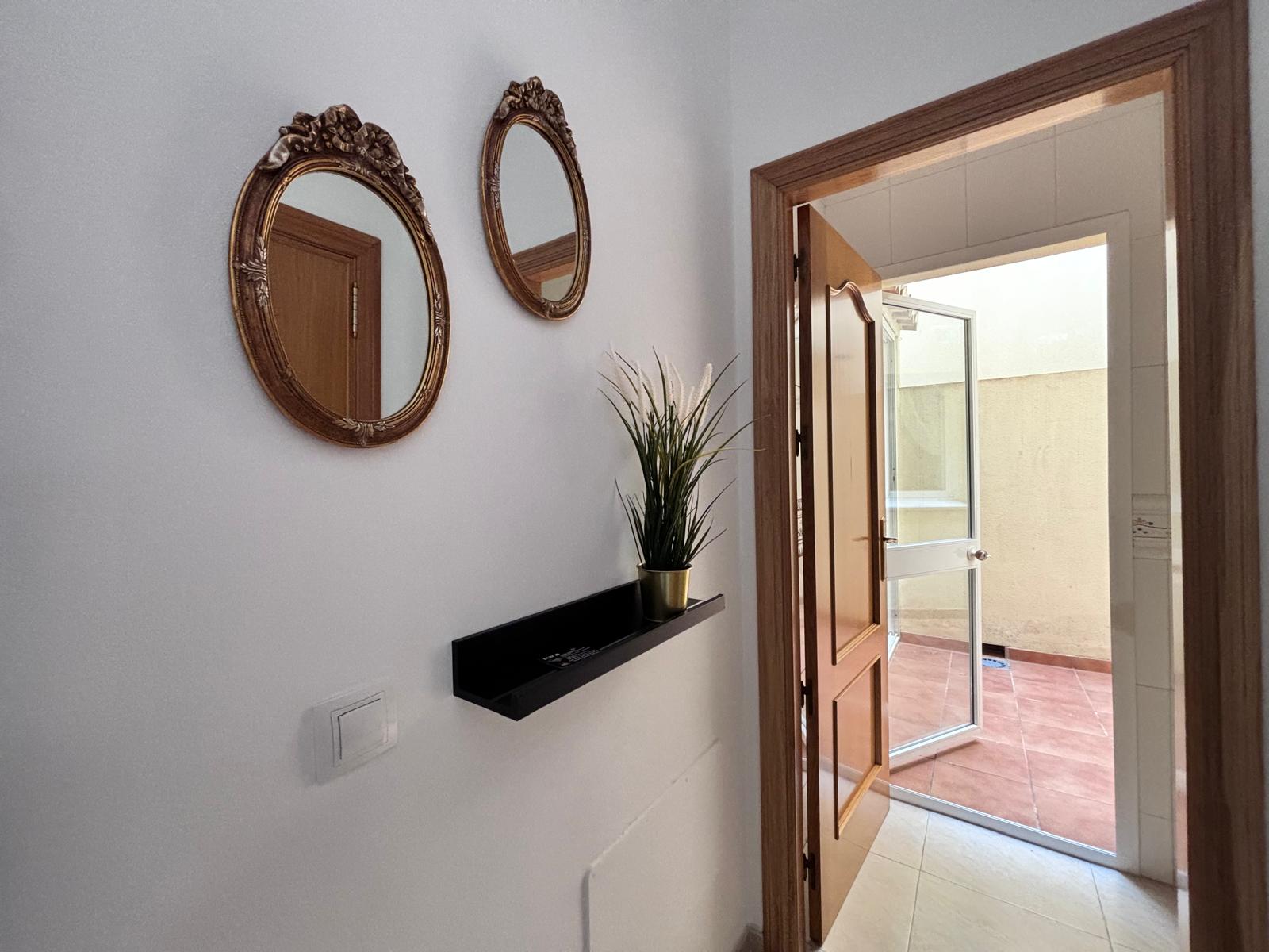 De gran tamaño y distribuido en una planta. Tiene dos entradas, una por el edificio principal y otra por la plaza, esta última privada, individual y con acceso directo a la gran terraza. Tiene dos dormitorios con cama de matrimonio uno y con dos camas individuales otro, dos baños completos, cocina muy bien equipada, salón comedor y patio.